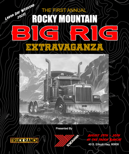 Join us August 29th - 30th, 2025 as the biggest and baddest rigs in the country take over the Truck Ranch for the First Annual Rocky Mountain Big Rig Extravaganza presented by Yokohama! 2 day show and shine, live equipment demos by 4 Rivers, food truck alley, BBQ cookoff, hot rod showdown and more! See the Tesla semi, test drive the all new Freightliner Cascadia, and check out the heavy artillery of the Fort Carson 4th Infantry Division! We have a surprise celebrity judge for the show, and a special musical guest you definitey won't want to miss! Full event schedule and registration info coming soon! |